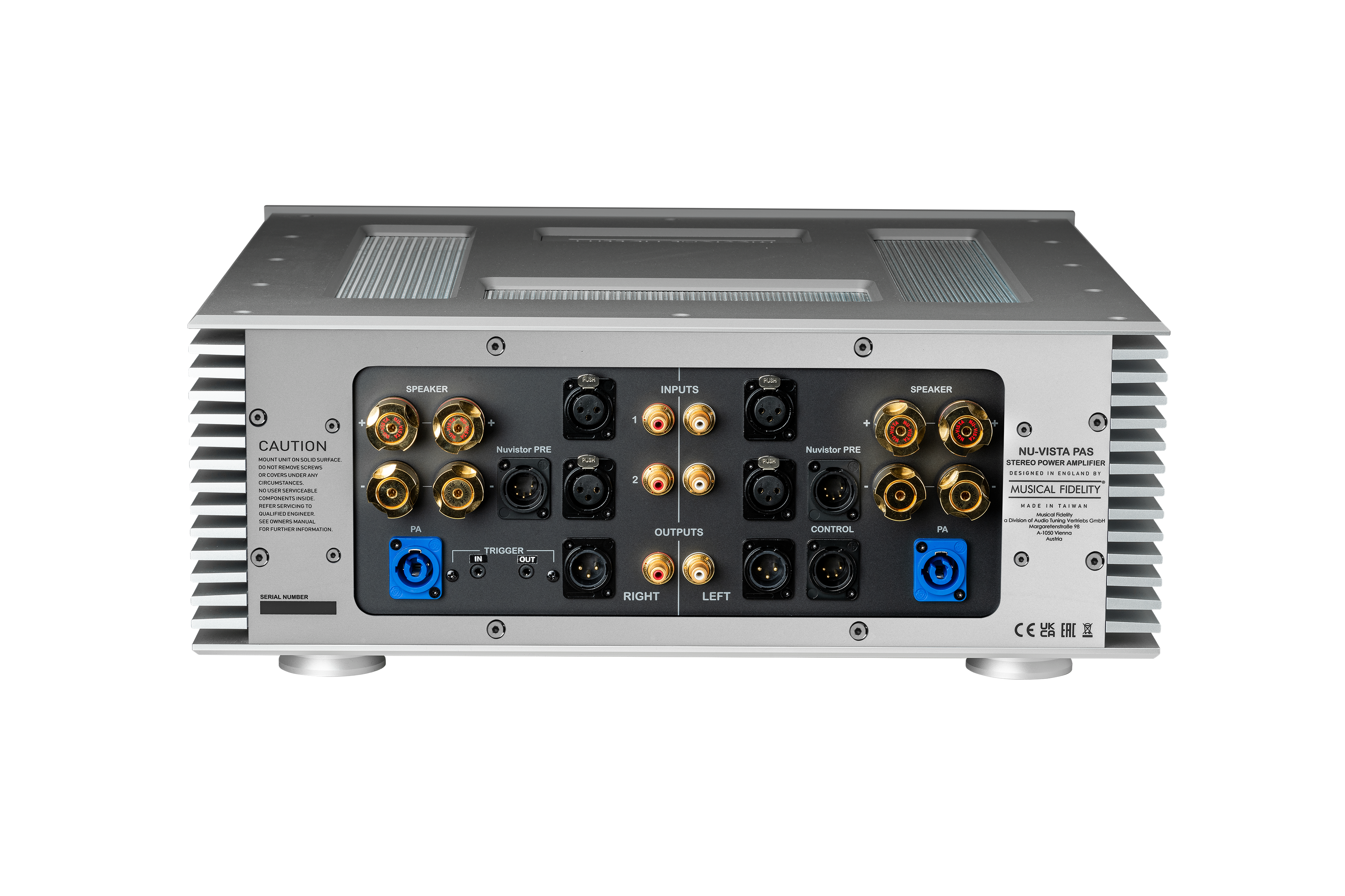 The Nu-Vista PAS‘s mechanical construction is uncompromisingly rigid and solid in typical Musical Fidelity tradition. Front panel and side panels are milled from extruded aluminum profiles and are extremely massive.