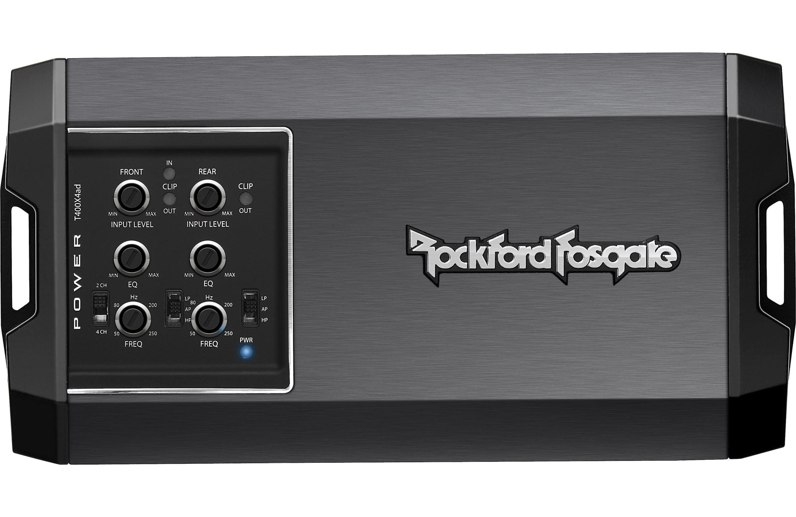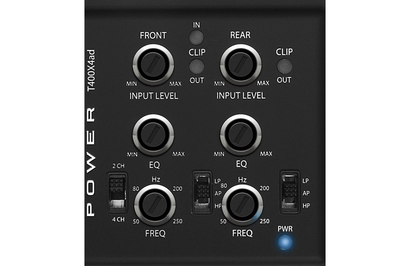 The Power T400X4ad 400 Watt 4-channel ultra-compact, amplifier is built on Rockford Fosgate s proprietary Class-AD technology, featuring Constant Power to produce the same output at both 4-Ohm and 2-Ohm impedances. Flexible vehicle integration enabled through low-level and high-level inputs with auto turn-on. Top mounted controls allow easy access to built-in crossover and C.L.E.A.N. input/output clip detection circuits. The 3-stage thermal lock extrusion with dual fan forced induction keeps everything cool while real-time thermal/protection schemes safeguard the amplifier.