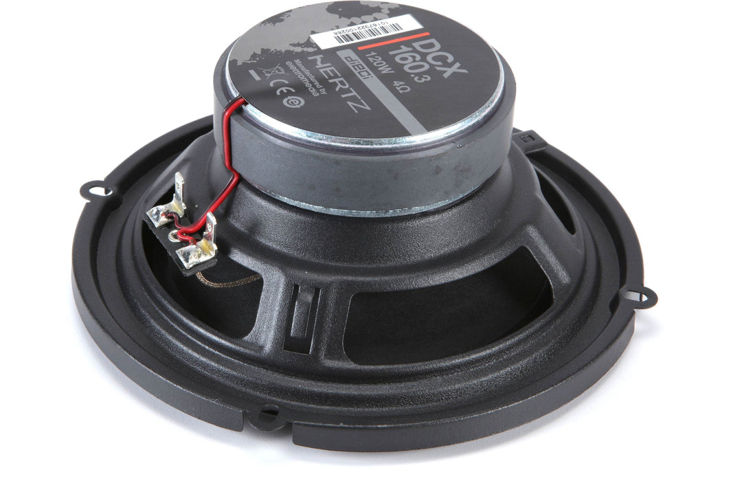 DCX 160.3160 (6) mm (in.) | 66.5 (2.62) mm (in.) | Two Way Coaxial | 120 W | 4 OhmTo meet all installation needs, without giving up on Hertz quality and performance, Hertz DCX 160.3 Dieci series car audio coaxial is designed with maniacal care to provide linear frequency response and ensure high reliability. A Neodymium magnet, PEI dome tweeter, built-in crossover, TPU (Thermoplastic polyurethane) surround and a pressed-paper cone provide the optimum ratio between installation friendliness and sound with dynamic and emotional impact. The new Hertz Dieci DCX 160.3 6” coaxial includes an adaptor ring designed for installation in GM and Honda models with 6” OEM speakers.