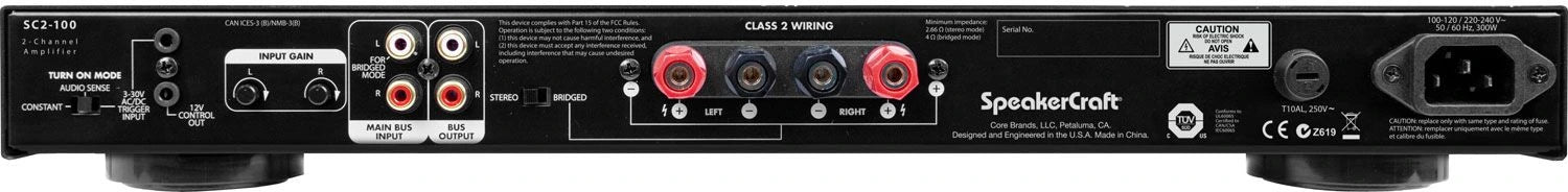 Offering the classic SpeakerCraft power and stability that you’ve come to know and trust, the New SC2-100 brings extremely high current power to a custom installed A/V System in a remarkably convenient way. Featuring audio circuitry constructed using the fi nest materials available, including 1% metal film resistors, high quality capacitors and oversized heat sinks that ensure proper cooling without the need for a noisy fan. This 2-channel amplifier provides 100W per channel (400W when bridged for higher output applications) and independent level control, making installation easier and more straight forward than ever before.}