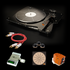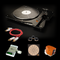 Drive to the platter is via a precision machined aluminum alloy pulley on the motor and a bespoke silicon rubber drive belt for smoothness and durability, while electronic speed change, via a switch to the rear of the plinth top-plate, adds to the ease of use and removes any need for belt-handling. Like the pulley, the platter itself is also precision-machined alloy, to the top of which is bonded a PETG record interface mat. On the underside a cork/Neoprene/nitrile bonded disc controls platter resonance.